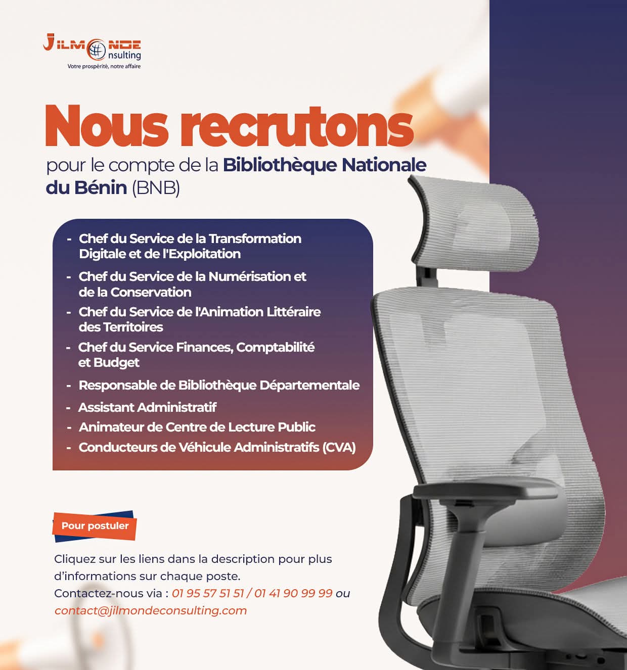 La Bibliothèque nationale du Bénin (BnB), dans le cadre de la modernisation de son organisation et du renforcement de la qualité de ses services, lance un processus de recrutement de plusieurs profils stratégiques afin d’accompagner la transformation digitale, l’extension des dispositifs de lecture publique et le renforcement des fonctions administratives et financières.