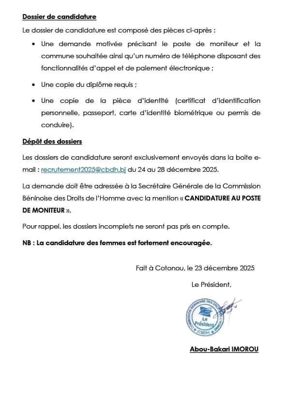🇧🇯📢 Appel à candidatures : la Commission Béninoise des Droits de l’Homme (CBDH) recrute des moniteurs pour les élections générales 2026.