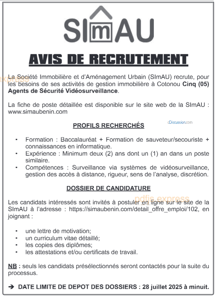 Recrutement de cinq Agents de Sécurité Vidéosurveillance