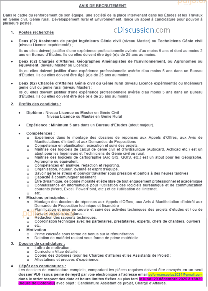 Recrutement de deux Assistants de projet Ingénieurs Génie Civil ou Techniciens Génie Civil