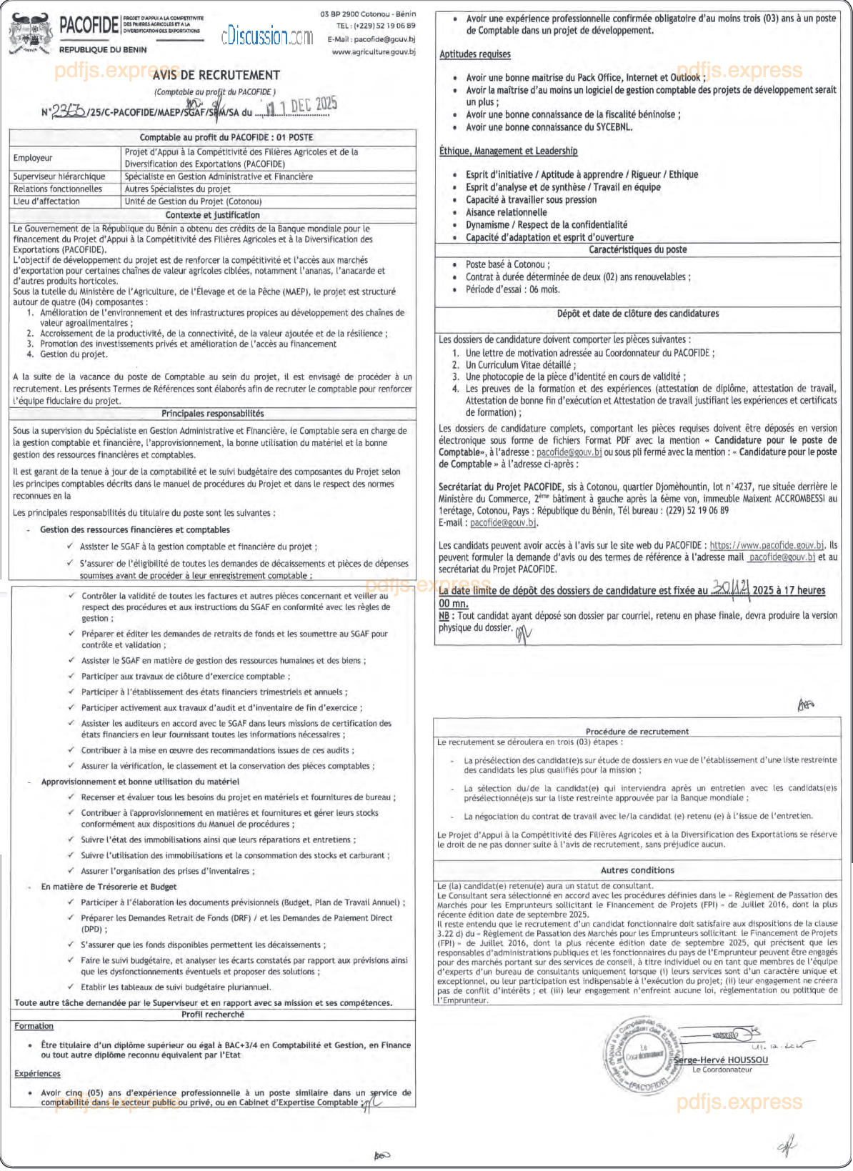 Avis de recrutement d'un comptable au profit du PACOFIDE