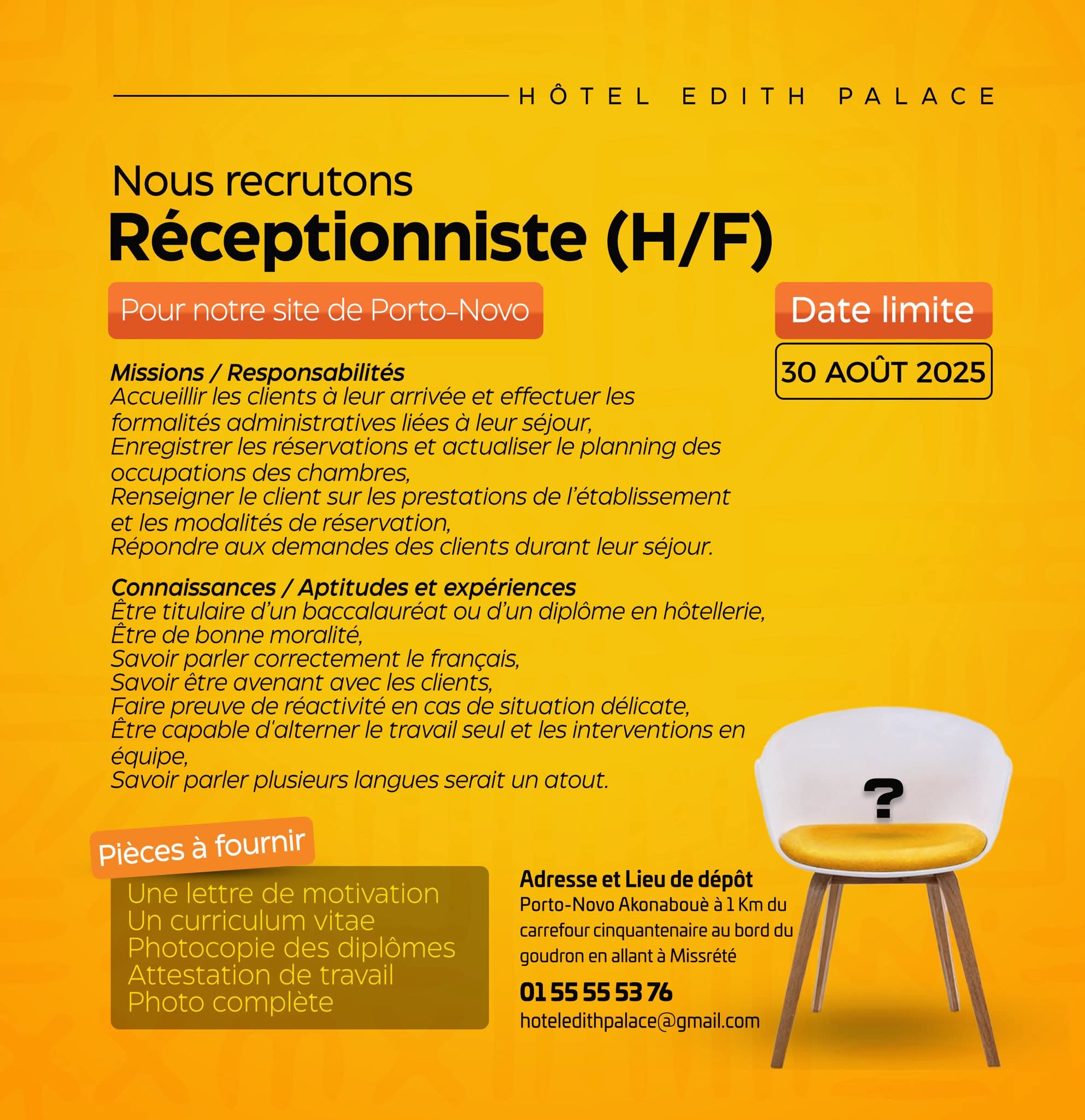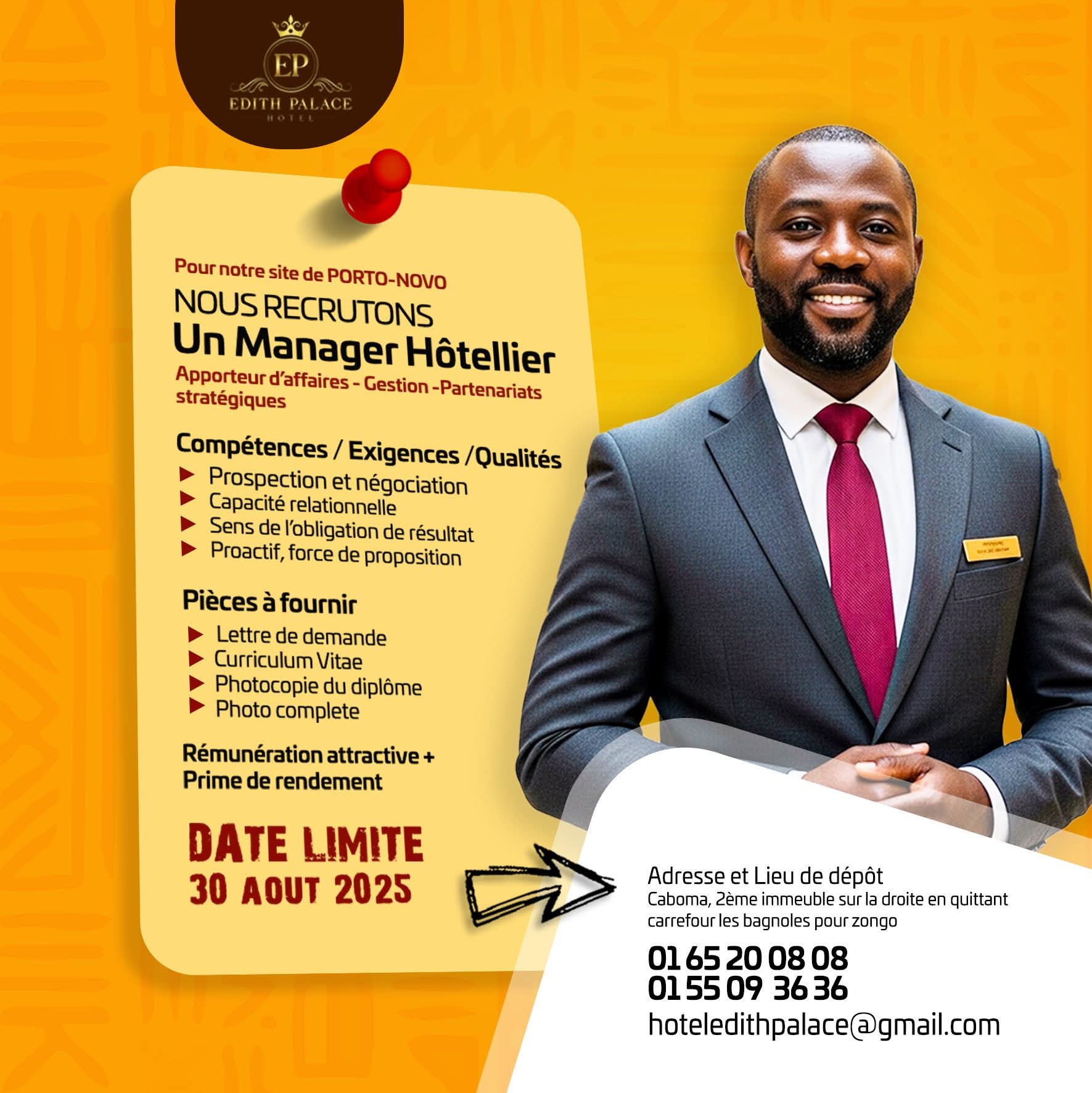 👉 Candidature à déposer sous plis fermé avec mention du poste à Caboma (2ème immeuble sur la droite en quittant le carrefour les bagnoles pour zongo) ou par mail : hoteledithpalace@gmail.com